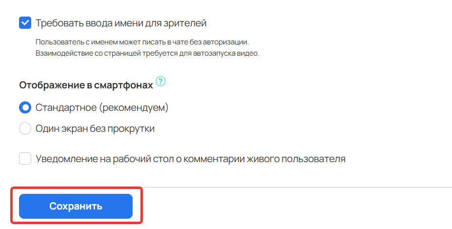 - По умолчанию элементы управления плеером Kinesсope будут выключены для зрителей. Если их необходимо отобразить, раскройте «Дополнительные настройки» и выключите опцию «Скрывать кнопки управления в видеоплеере для зрителей».