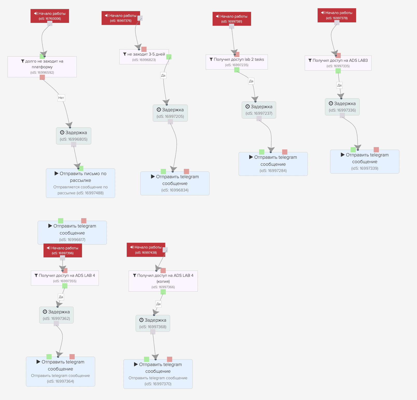 Хотим добавить процесс отправки сообщения на телеграм, когда ученик долго не заходит на платформу. Для этого добавили условие (на картинке).