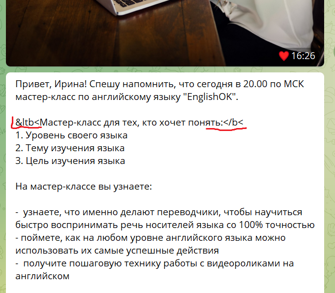 Я создала приветственное сообщение в телеграм, оно отправляется клиенту как надо.