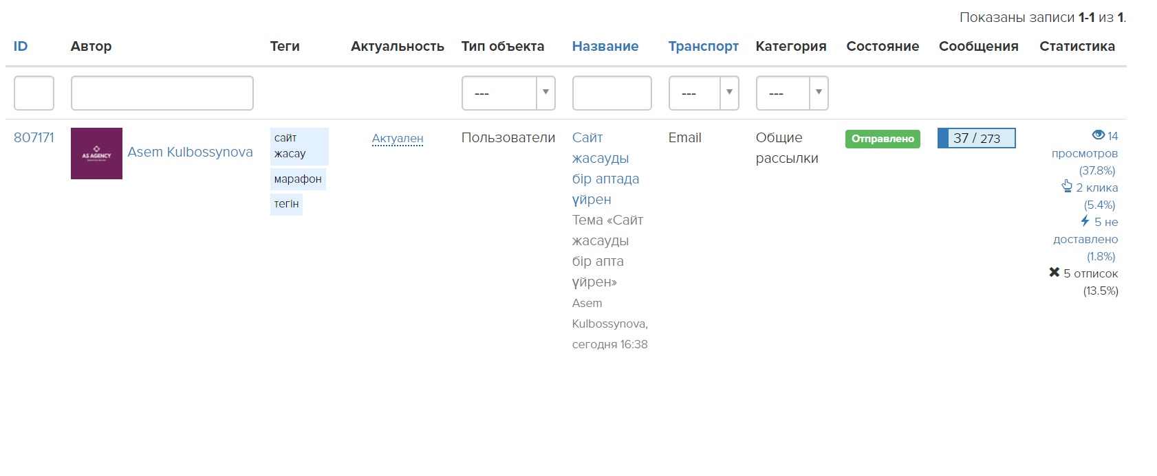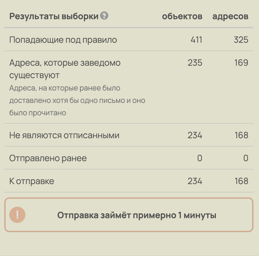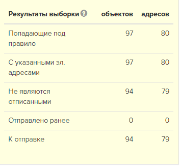 Важно: итоговое количество сообщений, которое будет отправлено по рассылке, отображается в таблице «Результаты выборки» в поле «К отправке». Данная таблица строится на момент последнего запуска рассылки.
