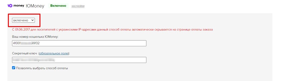 Чтобы данный способ отобразился для пользователей на странице оплаты, необходимо его включить: