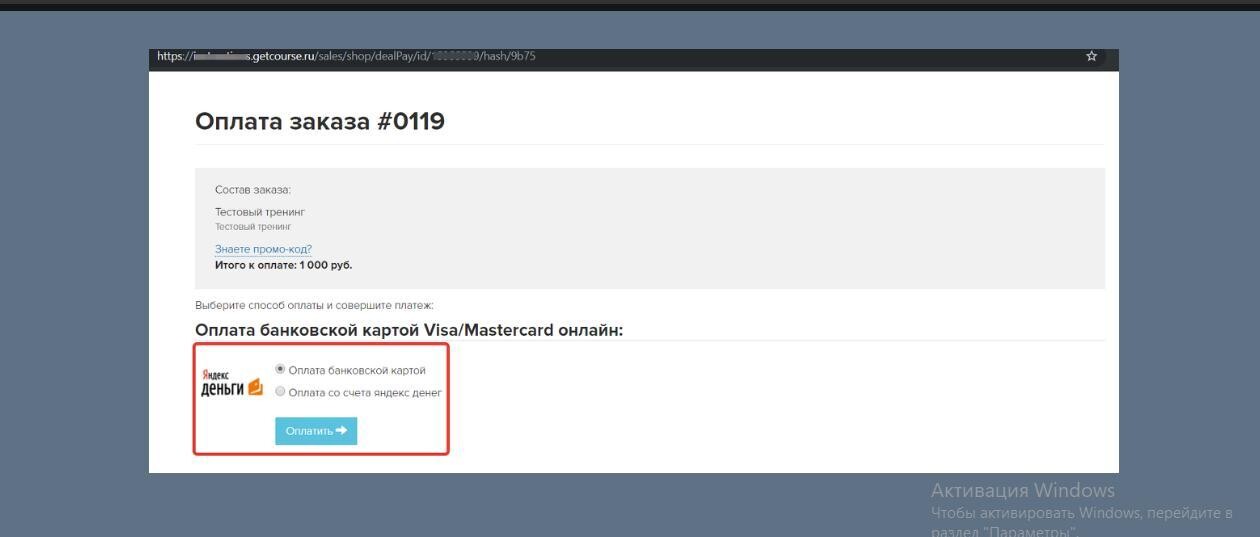 Если всё сделано правильно, на странице оплаты заказа отобразится платежная система ЮMoney, а заказы внутри Геткурса будут автоматически помечаться оплаченными при поступлении платежа от пользователя.