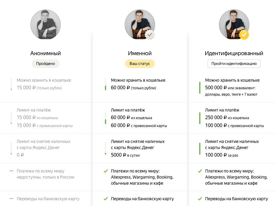 Подробнее о статусе кошелька Я,Деньги можно узнать по ссылке: https://money.yandex.ru/page?id=536140 .
