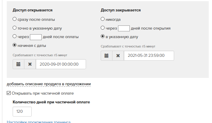 Можно настроить получение временного доступа к тренингу при частичной оплате.