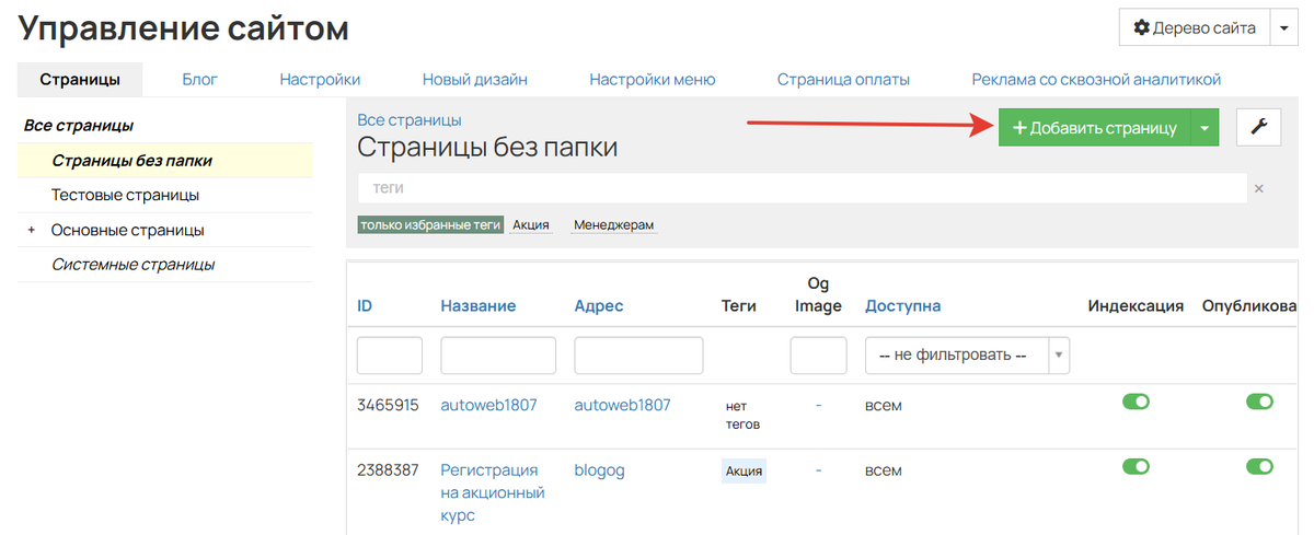 - Вернитесь в раздел «Сайт» — «Страницы».
