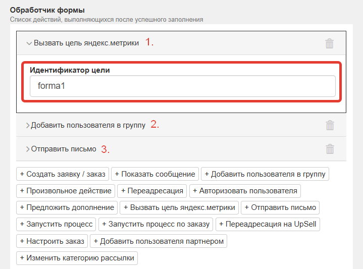 Если в форме настроено несколько действий, то рекомендуем поставить вызов цели Яндекс Метрики на первое место.