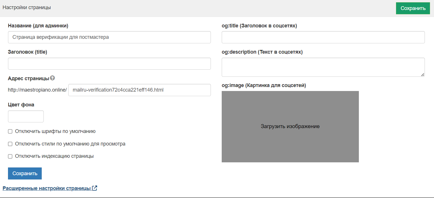 - Тип страницы: обычная и страница для верификации — вторая используется в том случае, когда для регистрации в некоторых сервисах требуется подтвердить, что домен принадлежит именно вам.