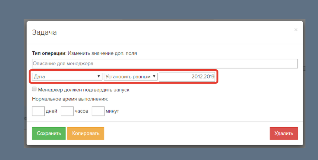 Также в окне операции «Изменить значение доп. поля» можно задать нормальное время выполнения задачи.