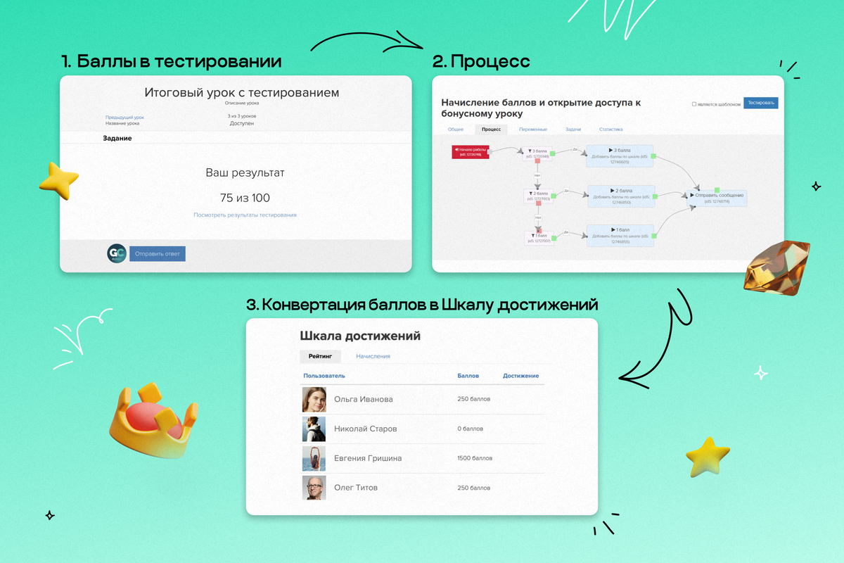 Автоматизировать перевод баллов за тестирование в баллы по шкале достижений можно, используя функционал процессов. Настройка процесса состоит из 3 этапов: