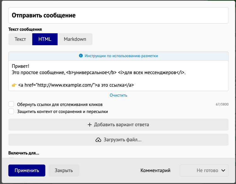 После этого примените разметку в соответствии с рекомендациями, представленными ниже. Внимание! Рекомендуется заполнить поле "текст", чтобы сохранить возможность отправить сообщение в мессенджеры, которые не поддерживают разметку. Если это поле не будет заполнено, сообщение может быть не доставлено в чаты, в которых не доступна разметка.