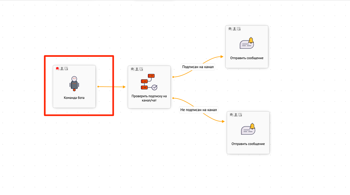 После этого вы можете моментально реагировать на подписку на канал, используя блок "событие Telegram". Воронка с проверкой и событиями может выглядеть так:
